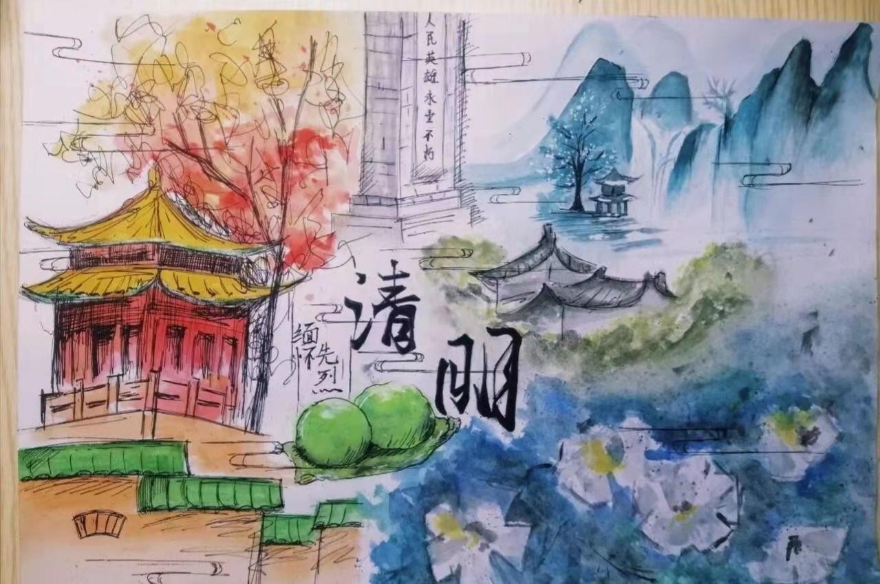 活动第一项,奏响雄浑高亢的《义勇军进行曲》,庄严地升起我们神圣的国旗。第二项,贾守通主任代表级部直播讲话,传达了菏泽市文明办的文明祭扫倡议书以及清明节教师寄语。讲话反响热烈,点赞14万。活动第三项,各班开展“清明祭英烈,接续向未来”线上缅怀诵读活动。各班选派一名代表,线上班内诵读。《寻梦环游记》告诉我们:死亡不是永久的告别,忘记才是。只要我们铭记,先烈之魂就永远存活于世间。活动第四项:曹一教师及学子自发网上献花留言、网络签名寄语。我们敬畏英雄,寄托哀思。四月清明,春回大地,阳和启蛰,清明既是哀悼也是走向新生的日子,我们带着对逝者的缅怀纪念,迎候生命的顽强不息。活动第五项:高二9班和14班美术作品展。清,那是人间的海晏河清;明,那是华夏的无限光明;节日,那是民族的高尚气节。怀着无比沉痛的心情和崇高的敬意祭扫先烈后,看曹一美术生作品下有着怎样的“自然与人文”的内涵。