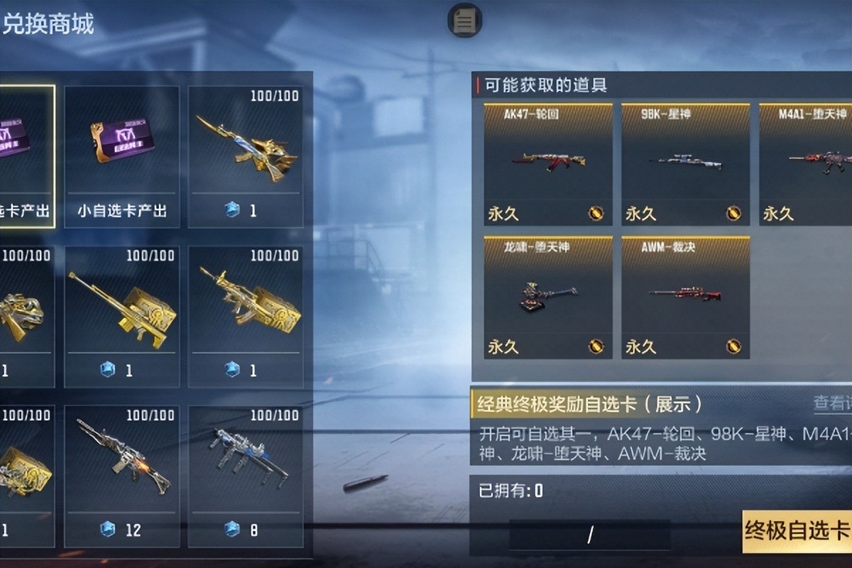 除此之外王者飞行棋和经典飞行器的奖池中还额外增加了小自选卡。小自选卡中的武器为往期钻石礼包的大奖,并且自选卡内容也会随着更新而进行变更。