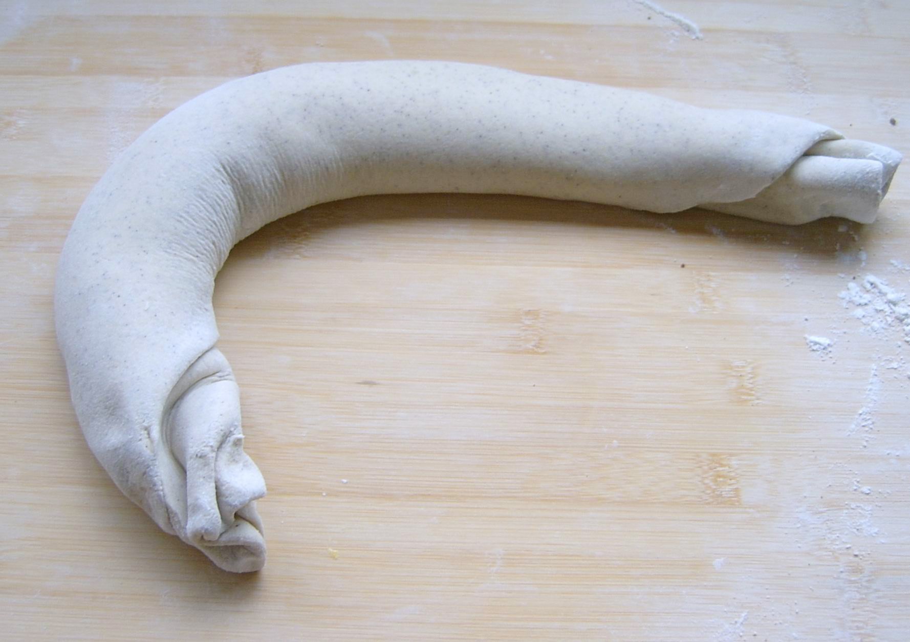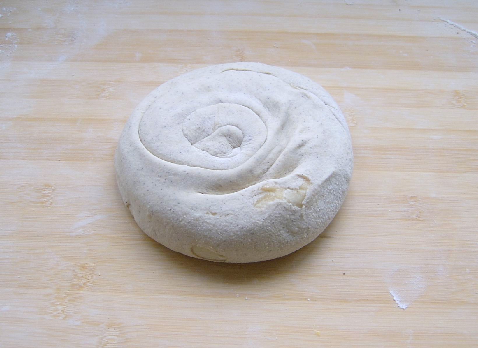 4、卷起,切开后卷成团状,卷时要用右手指微微往长扯,压实擀开。