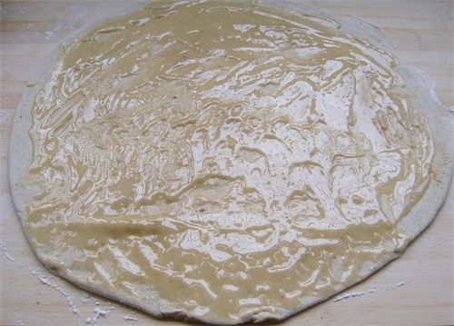 3、醒好的面团,分剂子,擀成面皮,刷上油酥。