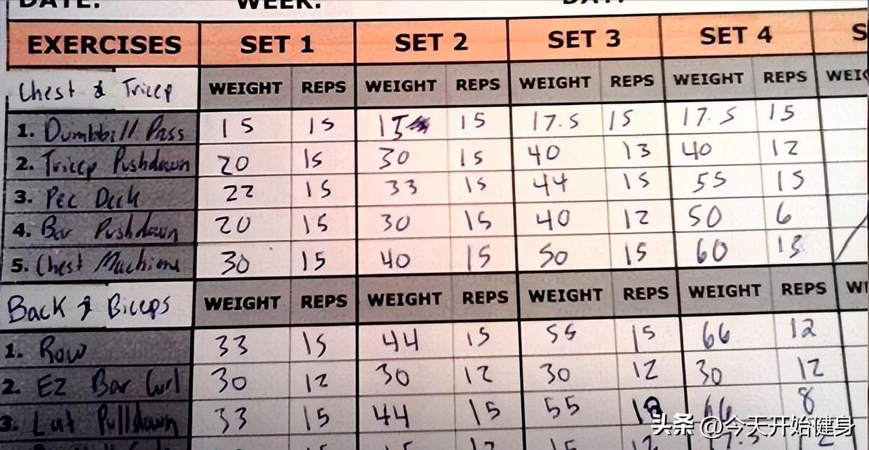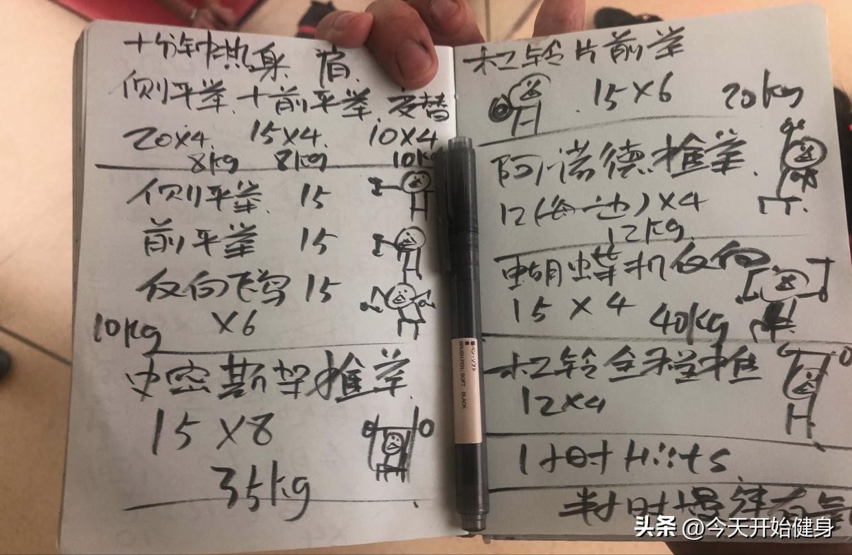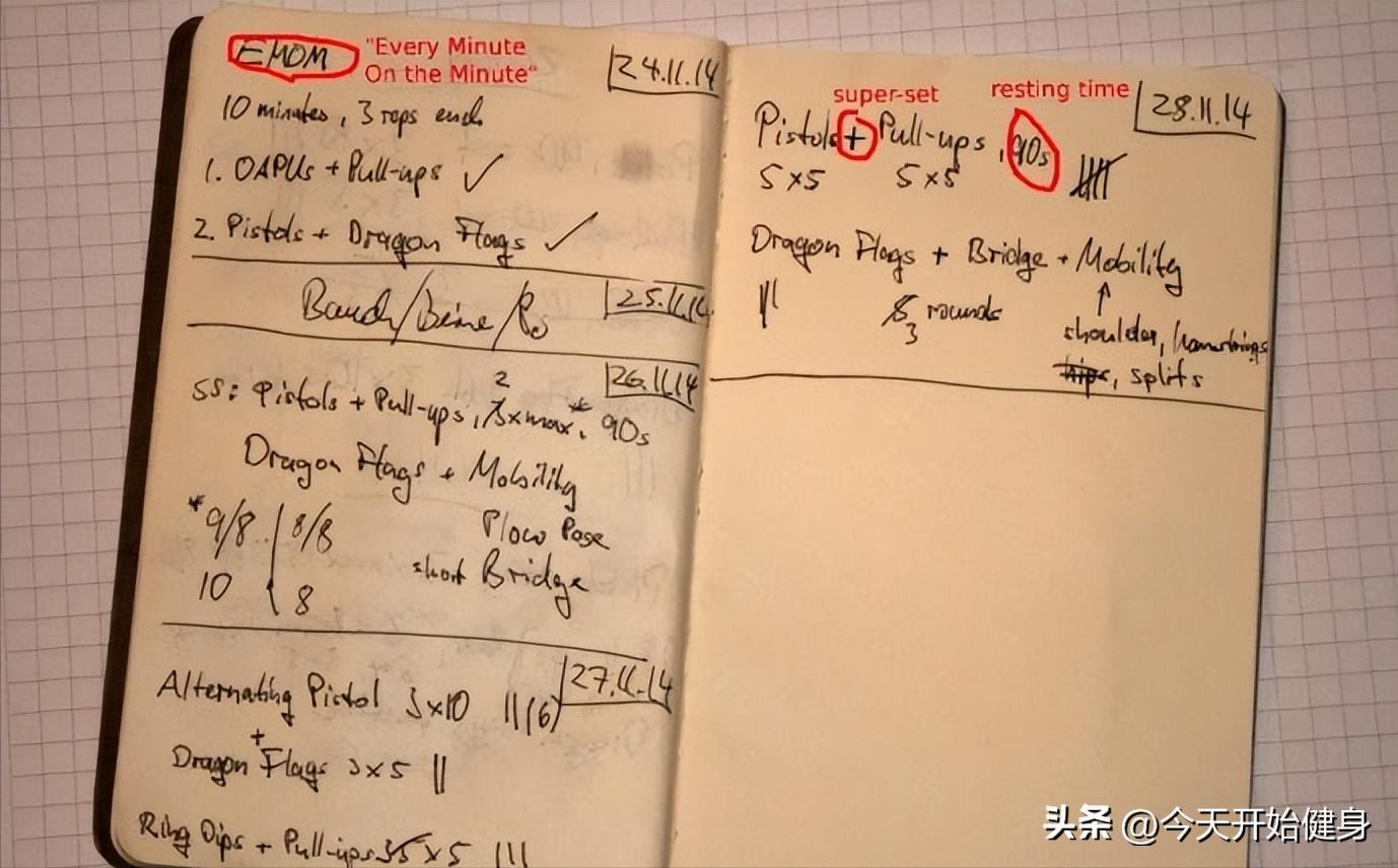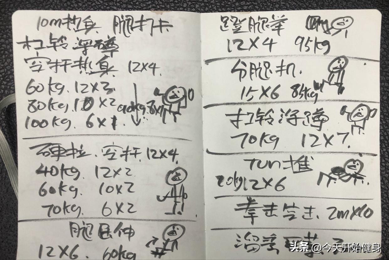 第三步,开始训练时可以记下自己做的组数,做一组、划一道杠杠,以免练着练着忘记自己做了多少组了。同时,如果你的实际训练内容和第二步记录的有偏差,别忘了准确记下来。