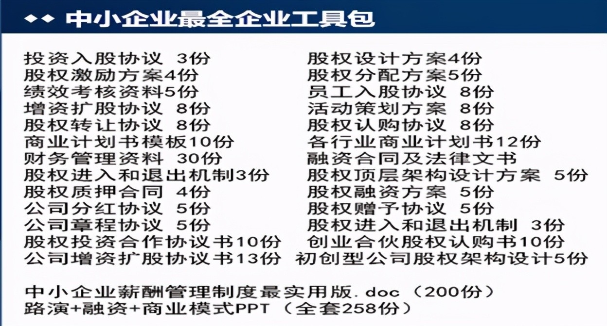 《中小企业最全工具宝》是由我司股权投资专家整理出来的,涵盖公司股权、商业模式、融资方案、内部管理、企业运营、绩效考核等工具资料!