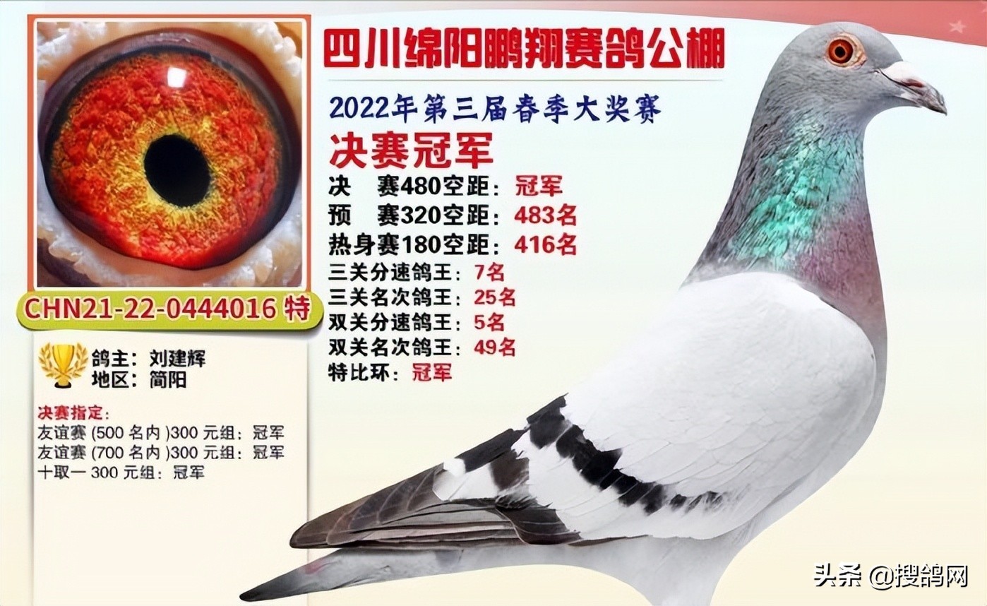 四川绵阳鹏翔赛鸽公棚今年是第三届春赛,比赛设180公里热身赛、320公里预赛、480公里决赛、500公里加战赛。绝杀关中,四川简阳鸽友刘建辉强势发力,他的一羽21-22-0444016灰鸽前两关均在前500名之内,最后一关再创佳绩,飞出1379.8119米/分的成绩,登上决赛冠军宝座。同时,这羽赛鸽也是特比环冠军。