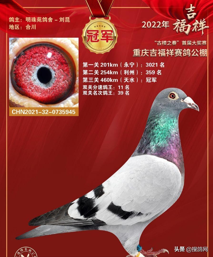 重庆吉福祥公棚今年是首届春赛,打完三关赛,仍有1511羽赛鸽冲击加强赛,尽显赛鸽品质和毅力。回顾决赛,3355羽赛鸽征战甘肃天水,明珠苑鸽舍-刘昆合川的一羽2021-32-0735945灰鸽,拿下冠军宝座,分速1450.4158米/分。但这羽赛鸽首关还在3000名开外,二关闯进400名内,决赛强势夺冠。