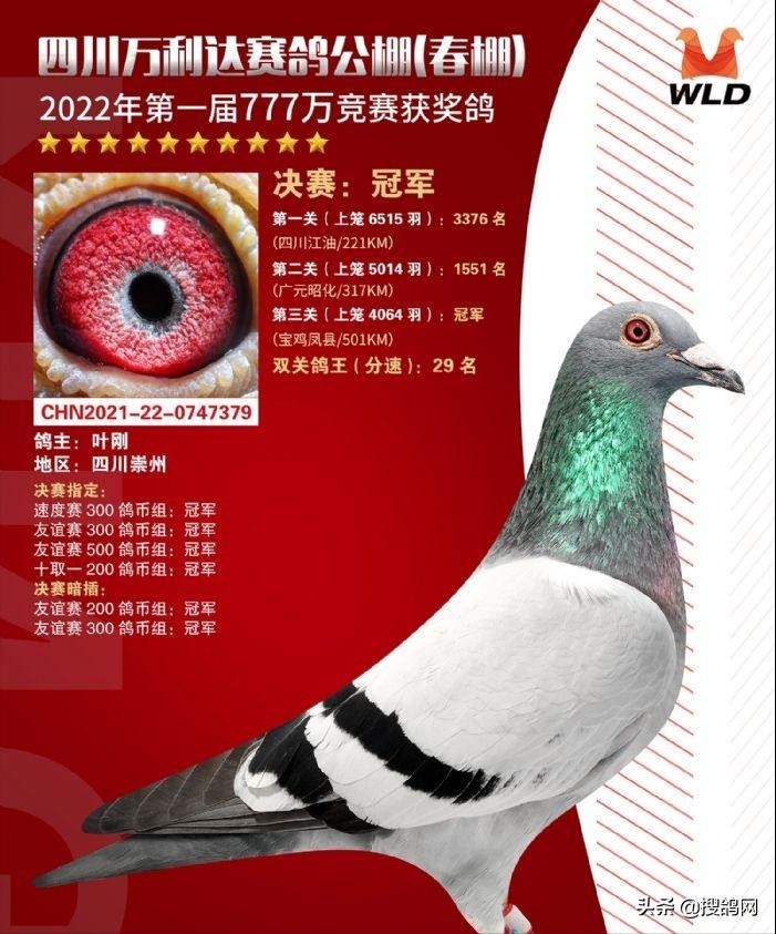 四川万利达春棚首届赛事伴随着221公里、317公里、501公里的三关赛落幕,四川崇州鸽友叶刚的一羽2021-22-0747379赛鸽越飞越快,拿下冠军,这羽赛鸽从三千多名,到一千多名,最后逆袭夺冠。而决赛季军得主也令人印象深刻,是来自上海名家王臣+黄锐富选送的一羽2021-09-0280379赛鸽,这羽赛鸽三关分别拿下117名、171名、季军,最终稳夺双关鸽王名次6名、双关鸽王分速冠军、三关鸽王名次亚军、三关鸽王分速冠军,尽显名家实力。看来厉害的名家到哪儿都能飞!