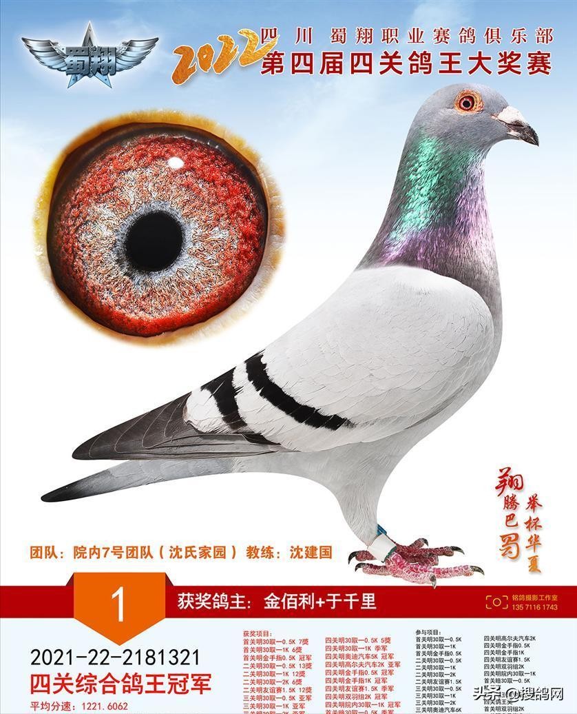 鏖战四关,鸽王诞生!四川蜀翔职业赛鸽俱乐部2022春季四关职业赛精彩纷呈,院内7号棚沈氏家园团队麾下金佰利+于千里的2021-22-2181321战鸽,四关稳定发挥,飞出了一关9名、院内殿军,二关23名、院内13名,三关季军、院内冠军,四关11名、院内亚军,登顶四关鸽王总冠军,同时获得双关鸽王殿军、三关鸽王冠军、超多指定大奖。