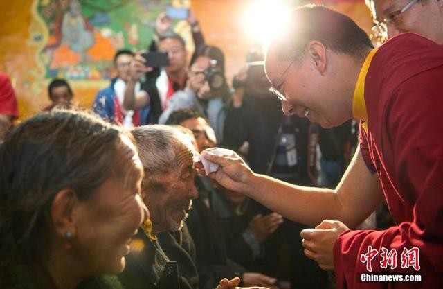 8月7日,中国佛教协会副会长十一世班禅额尔德尼•确吉杰布为术后的白内障患者揭纱布。(图片来源:中新网 摄影:何蓬磊)