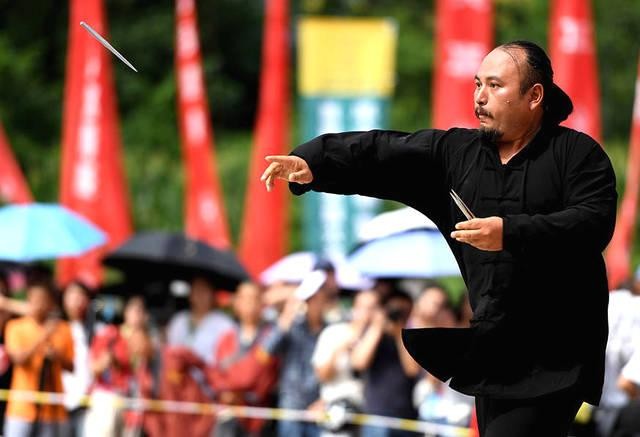 7月30日,嵩山少林寺无遮大会技艺选拔赛,一名选手在进行石锁项目比赛。(图片来源:新华网 摄影:李安)