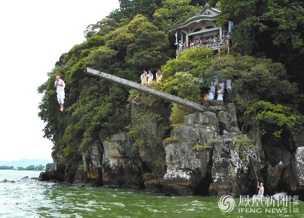 8月1日,日本滋贺县近江八幡市的伊崎寺,“伊崎飞杆”修行活动,一名僧人从杆上跳水瞬间。(图片来源:凤凰图片)