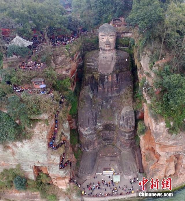 2月1日,农历正月初五,四川乐山大佛景区,4万余民众有序排队一睹大佛真容。(图片来源:中新网 摄影:刘忠俊)