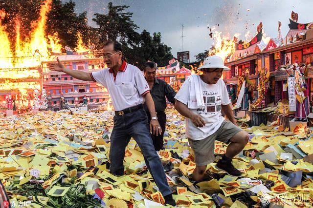 9月5日,印度尼西亚棉兰,为纪念中元节,印尼华人烧香、抛撒“冥币”、摆放祭品,悼念祖先、告慰亡灵。(图片来源:东方IC)