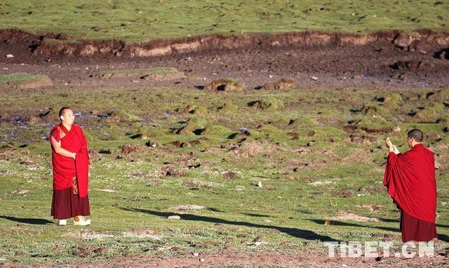 7月19日,玉树州隆宝滩自然保护区,十一世班禅额尔德尼•确吉杰布站在草原上,请随行人员为他拍照留念。(图片来源:中国西藏网 摄影:袁星宇)
