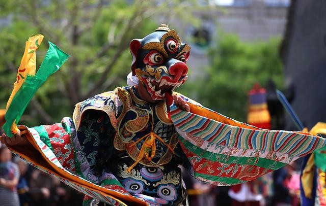 5月9日,沈阳皇寺抬佛节,僧人头戴面具身着色彩艳丽的服饰跳金刚舞。(图片来源:凤凰佛教 摄影:曜杰)