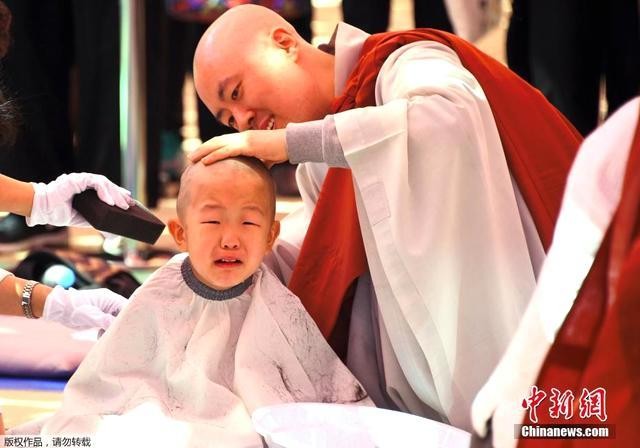 4月19日,首尔曹溪寺举行“童子僧削发及受戒仪式”,一名儿童哇哇大哭。(图片来源: 东方IC)