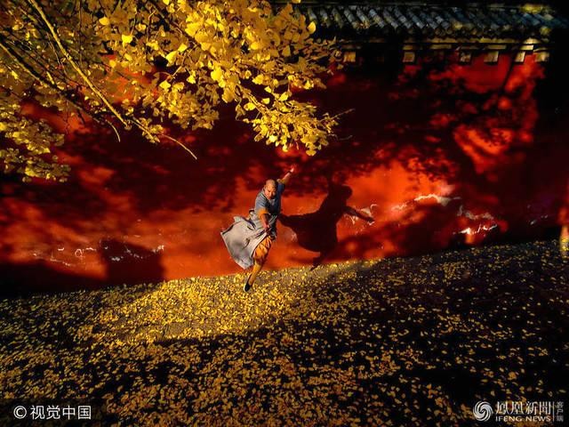 11月4日,嵩山少林寺,一名武僧在千年银杏树下练武。(图片来源:视觉中国 摄影:李传忠)