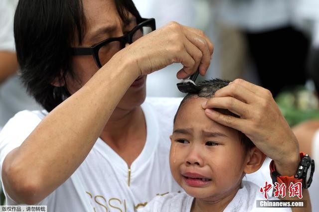 当地时间10月13日,泰国曼谷,举行沙弥尼剃度仪式悼念国王普密蓬。一位小女孩剃度时声泪俱下。(图片来源:中国新闻网)