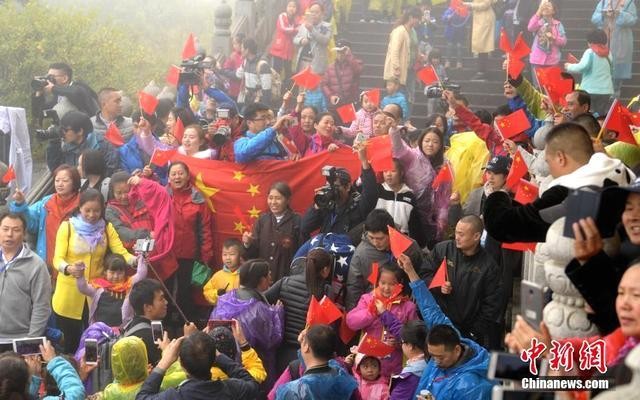 10月3日,四川峨眉山景区,海拔3079米的金顶上上千游客手拿国旗,跟随歌曲《歌唱祖国》的音乐齐声歌唱,祝福祖国68周岁华诞。(图片来源:中新网 摄影:刘忠俊)