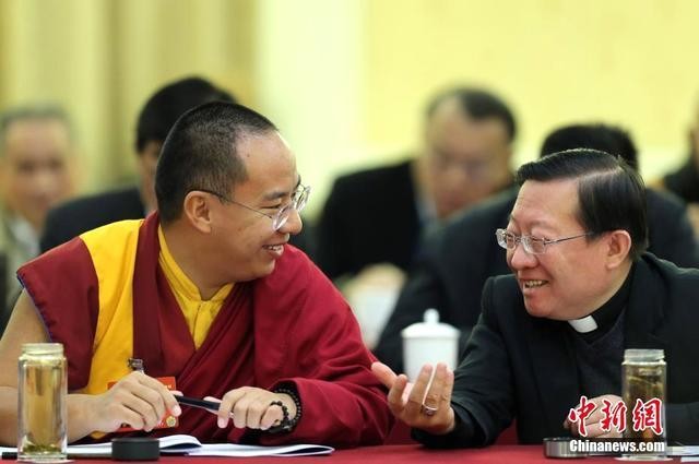 3月6日,全国政协十二届五次会议分组讨论政府工作报告。十一世班禅额尔德尼•确吉杰布(左)和马英林委员交谈。(图片来源:中新网 摄影:杨可佳)