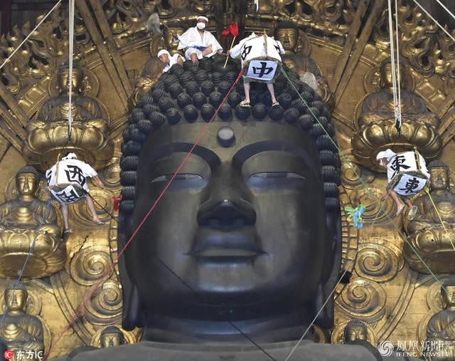 8月7日,日本奈良县,东大寺僧人爬上15米高的佛陀像,进行年度大扫除。(图片来源:东方IC)