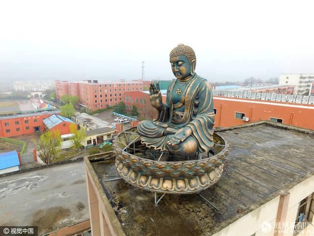 3月22日,河南郑州新密市一处废弃厂房楼顶,一尊5米多高大佛正襟危坐,从远处便能看到,异常醒目。(图片来源:视觉中国)