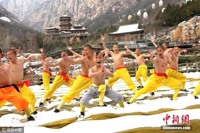 2月22日,少林武僧们赤膊上身在冰天雪地里苦练少林功夫,最小的只有6岁。(图片来源:视觉中国)