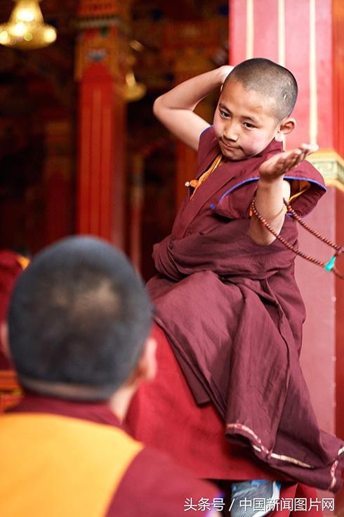 4月12日,西藏佛学院辩经中的小活佛。(图片来源:中新网 摄影:何蓬磊)