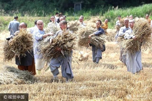 6月15日,登封嵩山几十位少林寺僧人在麦田中挥起镰刀,收麦、打谷,装袋,装车,在田间忙得热火朝天。(图片来源:视觉中国)