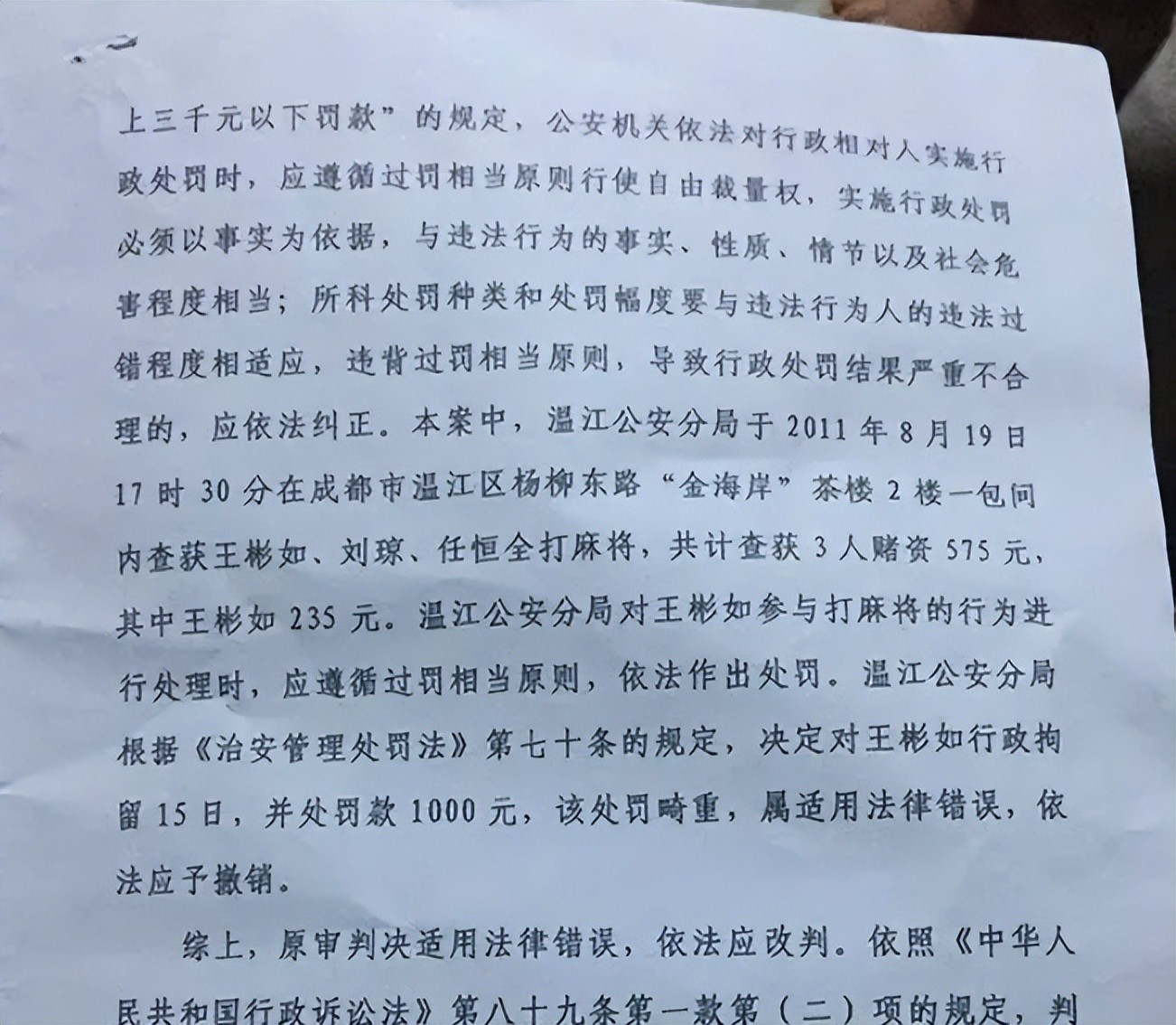 2018年6月末,最高人民法院作出再审判决,四川高院认为,温江区公安分局此前依照赌博罪名对王女士作出的处罚畸重,属于适用法错误,应予以撤销。