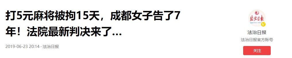 2019-06-23 20:14 法治日报 《打5元麻将被拘15天,成都女子告了7年!法院最新判决来了…》