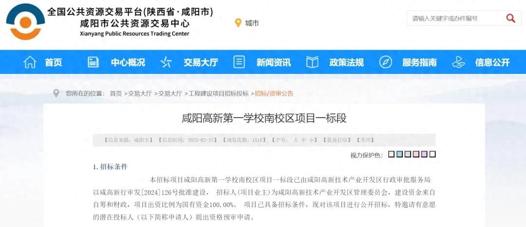 “咸阳高新第一学校南校区项目一标段”近日在全国公共资源交易平台(陕西省·咸阳市)发布招标公告,标志着咸阳高新第一学校南校区将进入建设周期,工程“进度条”拉开推进。