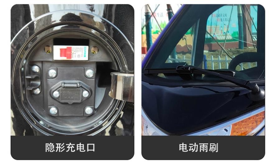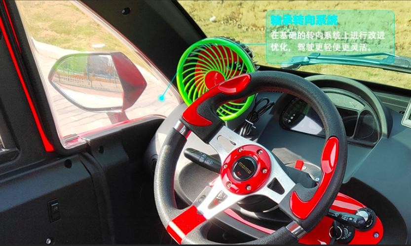 该车尺寸为2.2*1.2*1.5mm,轴距为1.61米。配置了135/70R-12铝合金真空轮胎,四轮独立悬挂设计,离地间隙15cm,可以轻松通过一些砂石路,坑洼路面。内部空间也十分宽敞,采用了双排三座的布局,一次可以接2娃。