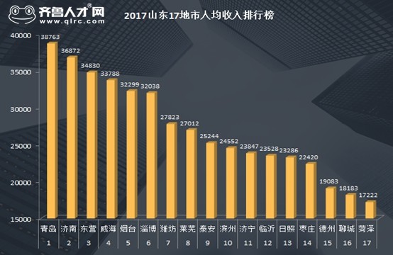 鲁网记者于齐鲁人才网发布的17地市人均收入排行榜中发现,人均收入超过全省平均水平的城市有8个,青岛市以38763元排全省第一。