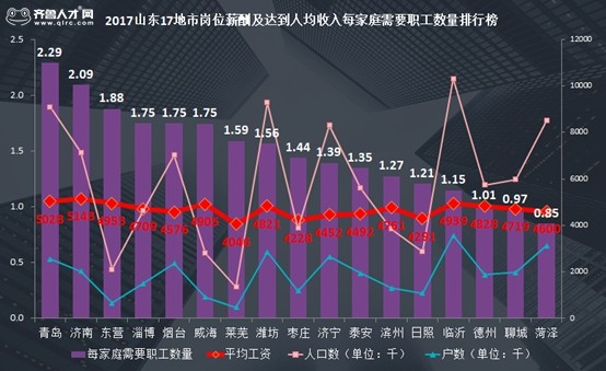 数据显示,要达到人均收入2.69万,按照每家庭需要职工数量的算法,青岛每个家庭需要2.29人,济南需要2.09人;东营市排在第三位,达到人均收入平均水平需要1.88人;淄博、烟台、威海排名并列,达到其地区的人均收入水平,每家庭需要1.75人上班;莱芜需要1.59人、潍坊需要1.56人;枣庄、济宁、泰安、滨州、日照、临沂、德州7市达到其地区人均收入需要人数均低于1.5人;聊城和菏泽单职工家庭即可达到其地区的人均收入水平,其中聊城需要0.97人,菏泽需要0.85人。