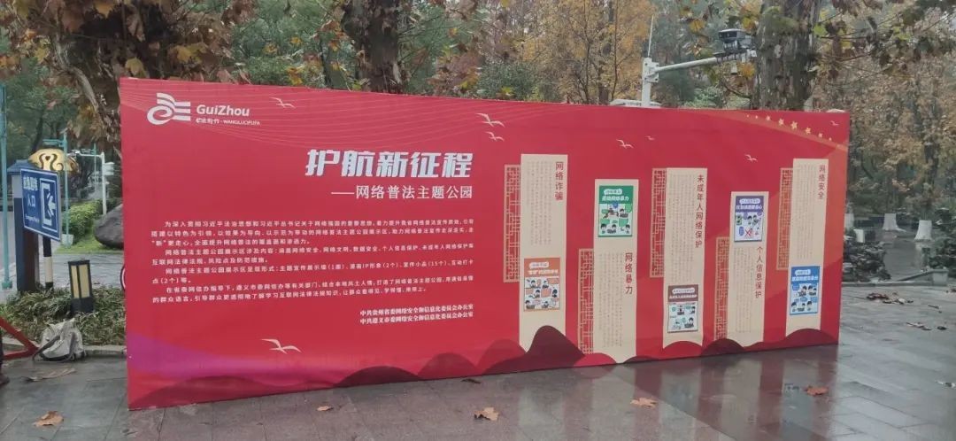 遵义市委网信办依托遵义纪念公园打造网络普法主题公园,展示涵盖网络安全、网络文明、数据安全、个人信息保护、未成年人网络保护等互联网法律法规,以主题宣传展示墙、漫画IP形象、宣传小品及互动打卡点等形式进行普法宣传。