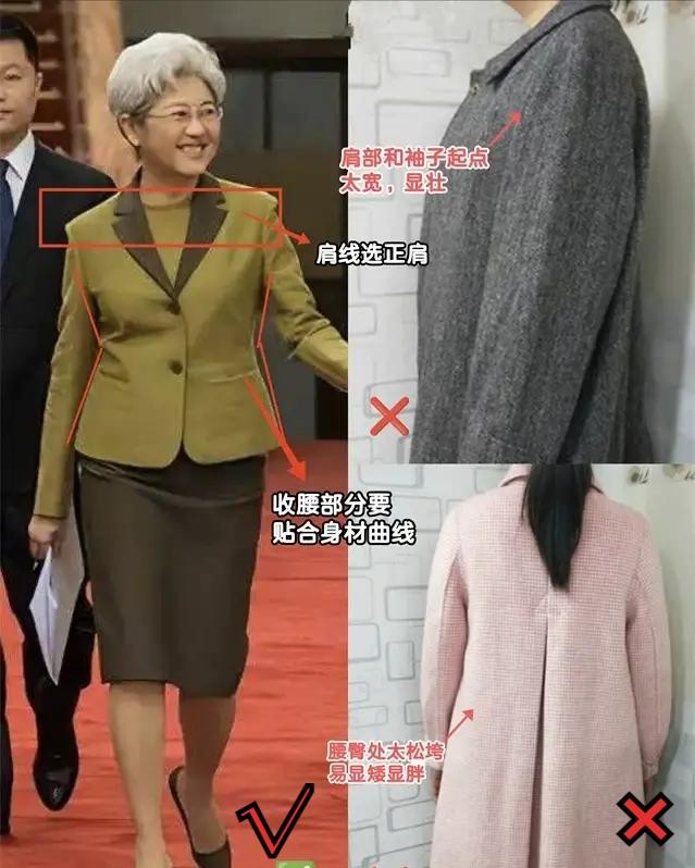 比如说老年常见的拜拜肉、脖子短、腹部有赘肉等,我们就可以选择正肩线的款式,让肩膀处更有型,加上V领的设计,让脖颈处有留白,也可以稍微拉长脖颈线条。