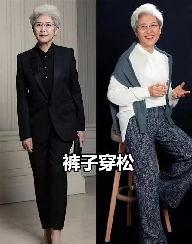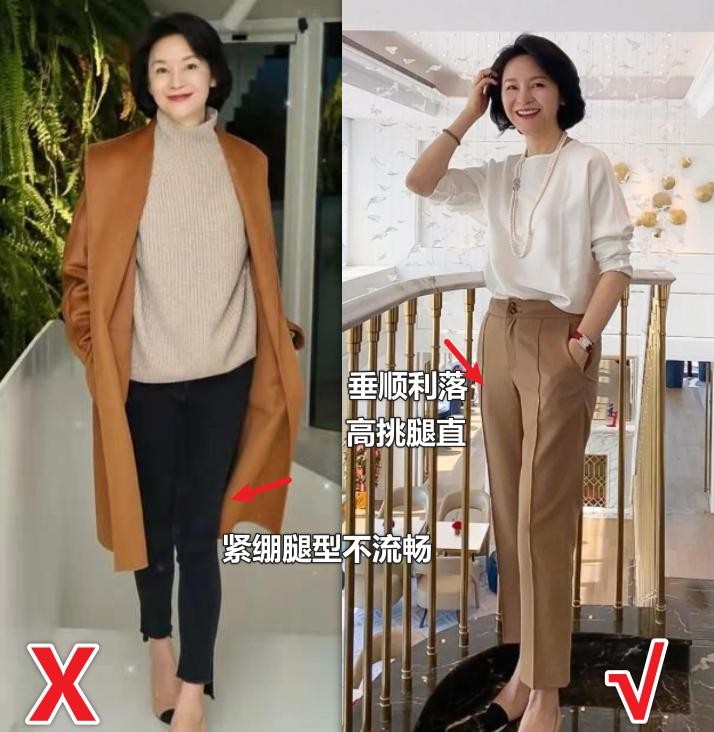 中年女性穿裤子,记得“平衡量感”。也就是说整体不能太过松散显矮,也不要太过修身显胖,与上身保持好的平衡。