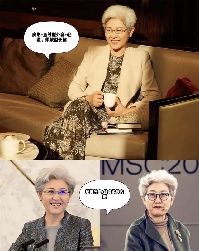 比如说像傅莹,在正式场合中都是西装+西裤的“女强人”穿搭,但在没有那么正式的场合中 ,基本都会用女性化的单品去中和那种强势,给人一种专业但不冷漠的感觉。