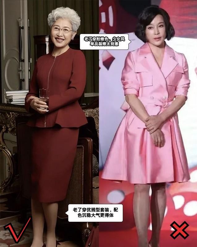 其次就是款式上不要一味地追求设计或者年轻化,很容易陷入扮嫩的误区中。到了中年这个时期就别碰少女感十足的粉嫩公主裙。学习傅莹,选择简约大方的暗红色套装裙,略微收腰的小设计就将时尚和精致都体现出来了。