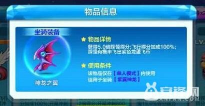 神龙之翼获得5倍踩怪得分加成,飞行得分加成100%。踩怪有概率飞出紫色龙蛋飞币