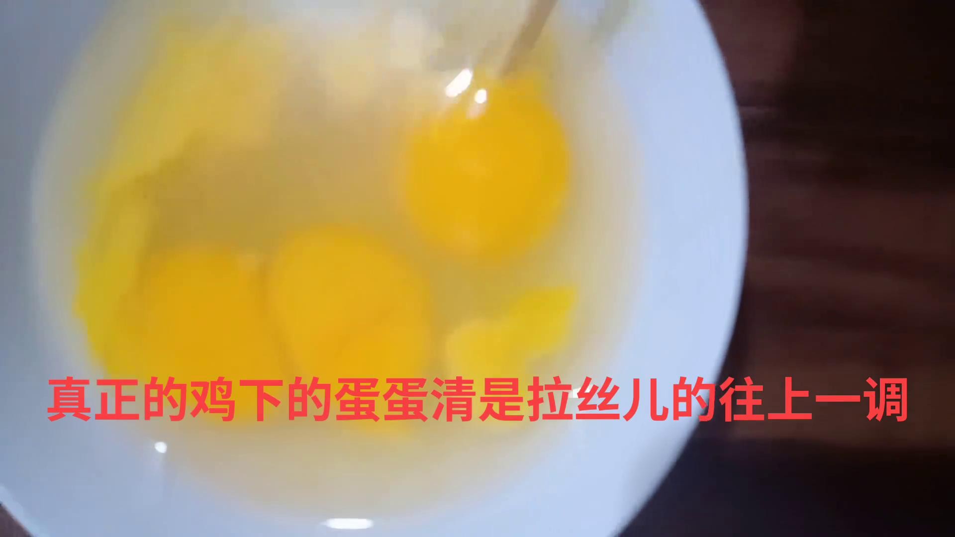 2. 大家平常的时候是否观察过,如果是真正的鸡下的蛋,蛋黄上面有一个类似于有一个圆圆的眼睛,但是这里翻了好几遍是没有的。鸡蛋清类似于水,真正的鸡下的蛋蛋清是拉丝儿的,往上一挑,挑不断,而这没有。怎么挑也不粘筷子,像清水一样。怎么调也没有丝,也不粘稠。