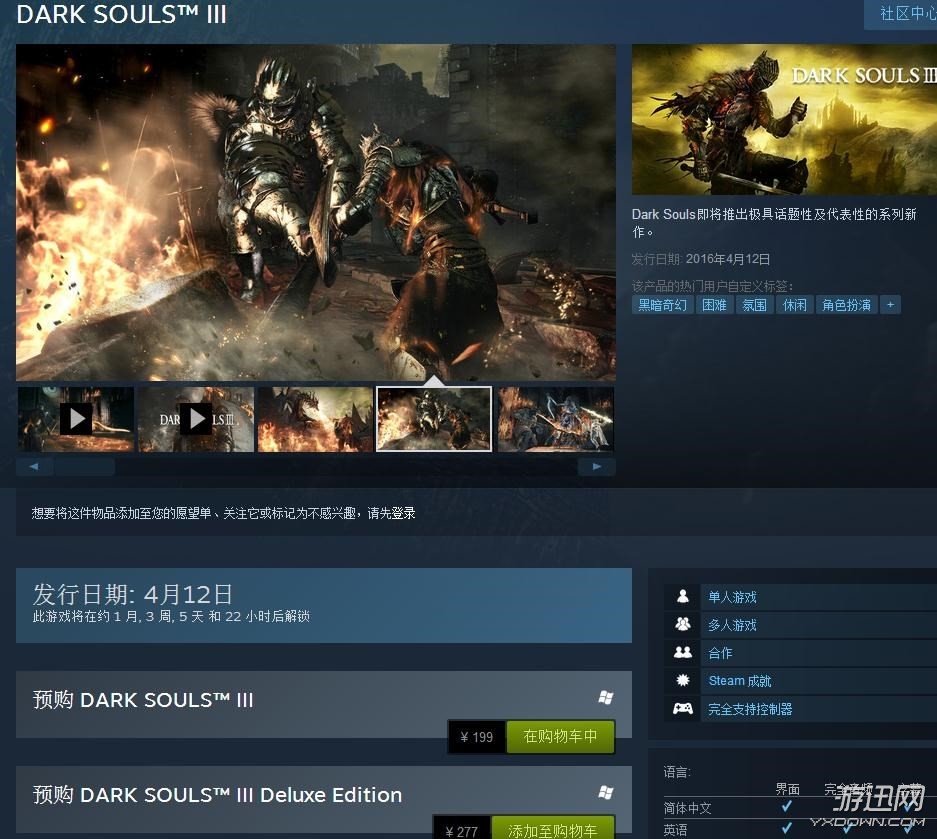 《黑暗之魂3》PC版预售开启 Steam国区售价仅为199元!