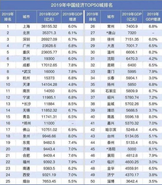 2019年中国城市TOP50强GDP排行!