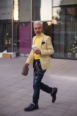 黄色英伦风小西服,走在街上绝对吸睛,搭配破洞牛仔裤,不得不说张双利非常大胆。不过如果没有这种独特的气质,是不会采用这样的穿搭的。真的是穿出了自己的风格,时尚与年龄无关。