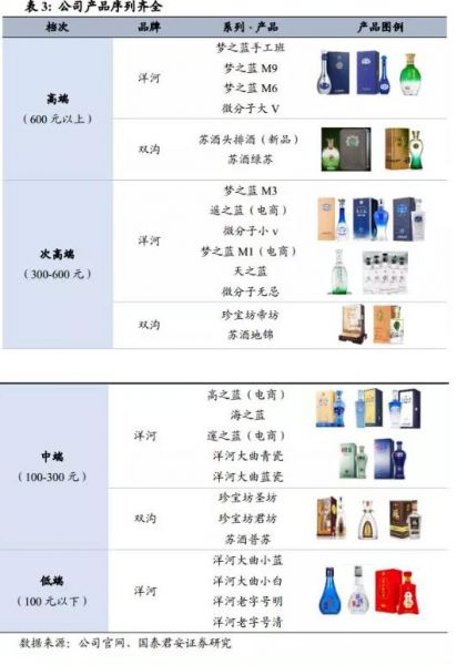 从价位来看,海之蓝、天之蓝覆盖100-300元的中端市场,梦3覆盖300-600元的次高端市场,梦6覆盖600到1000元的市场,梦9和手工班则覆盖1000元以上的市场。100元以下的则是洋河大曲蓝瓷、青瓷、洋河敦煌等产品。除此之外,双沟系列在各个价位段也有对应产品。