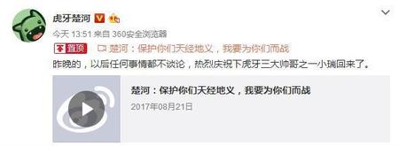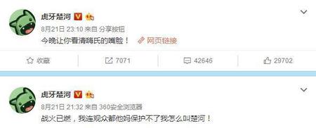 那么,最近粗大事啦!虎牙平台的王者荣耀一哥【嗨氏】和主机区的一个【楚河】大吵起来了。