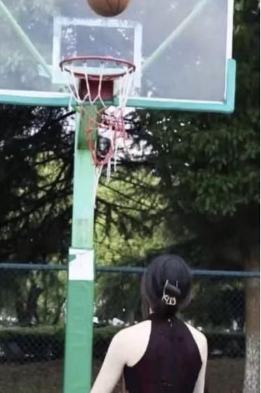 挡在篮球框面前,与男大学生合拍。