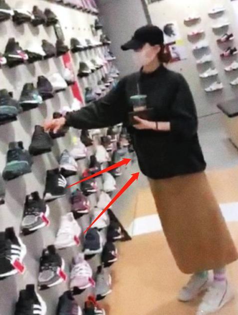 挺孕肚照曝光,刘诗诗来到一家鞋店正在挑选鞋子,手里还端着
