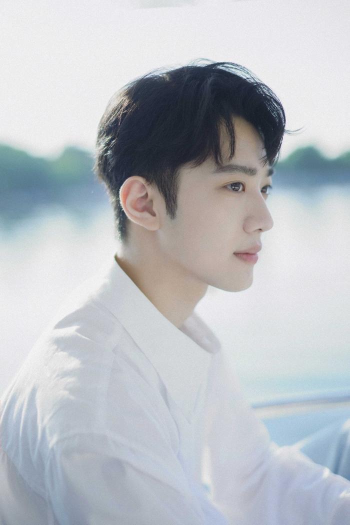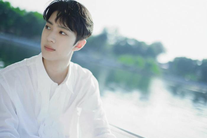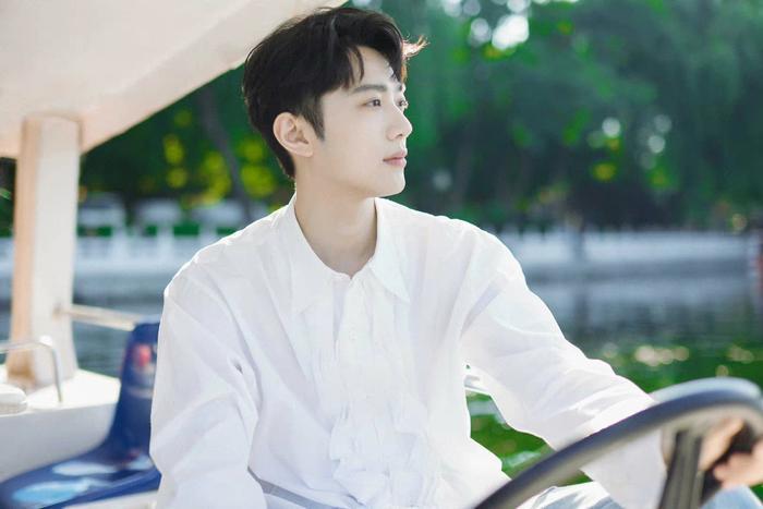 照片中,赖冠霖身穿简约白色衬衣搭配逗号刘海,微风徐徐,徜徉湖面,少年置身于绿意葱葱的大自然中,透露出独属于他的浪漫和温柔。
