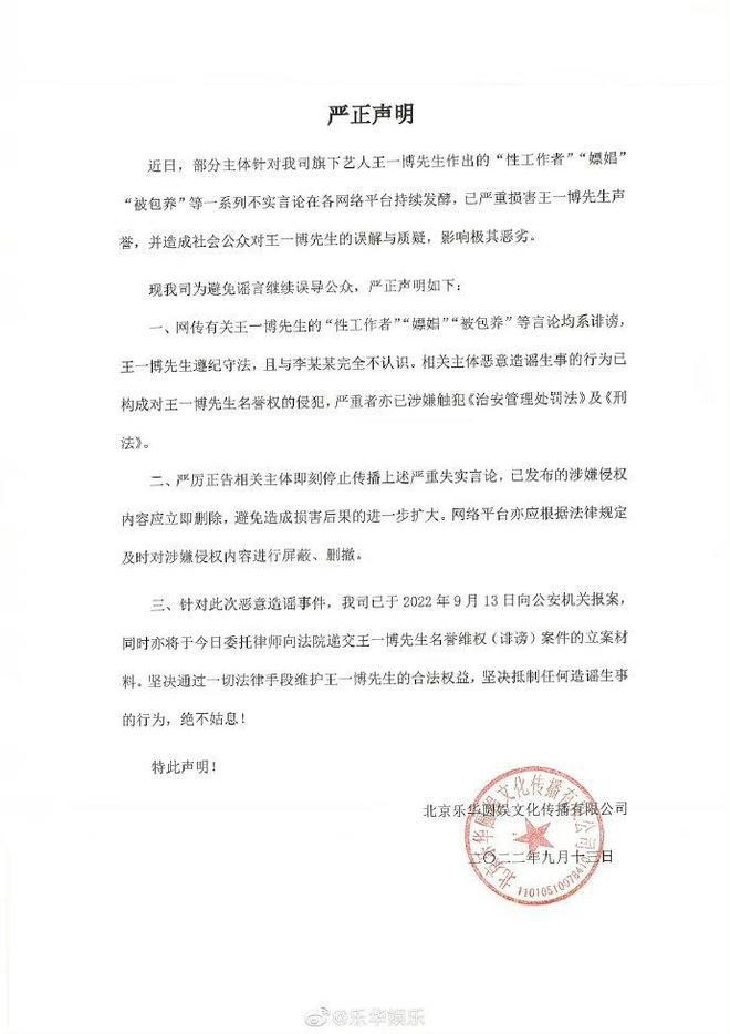 声明称:" 此类不实言论在各网络平台持续发酵,已严重损害王一博先生声誉,并造成社会公众对王一博先生的误解与质疑,影响极其恶劣。王一博先生遵纪守法,且与李某某完全不认识 ",并 " 严厉正告相关主体即刻停止传播上述严重失实言论,已发布的涉嫌侵权内容应立即删除,避免造成损害后果的进一步扩大。" 最后针对此次恶意造谣事件,乐华已向公安机关报案,同时亦将于今日委托律师向法院递交王一博先生名誉维权(诽谤)案件的立案材料,坚决抵制任何造谣生事 的行为。