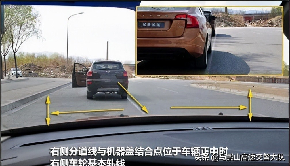 因为驾驶员位置在左侧,所以判断右侧车轮位置的方法与左侧稍有不同。如下图当右侧的车道白线与机器盖中央位置重合时车辆就基本压线了。